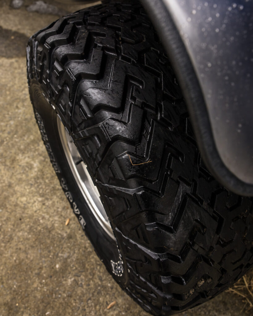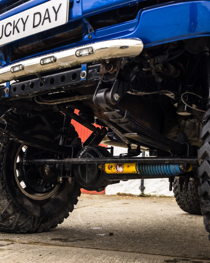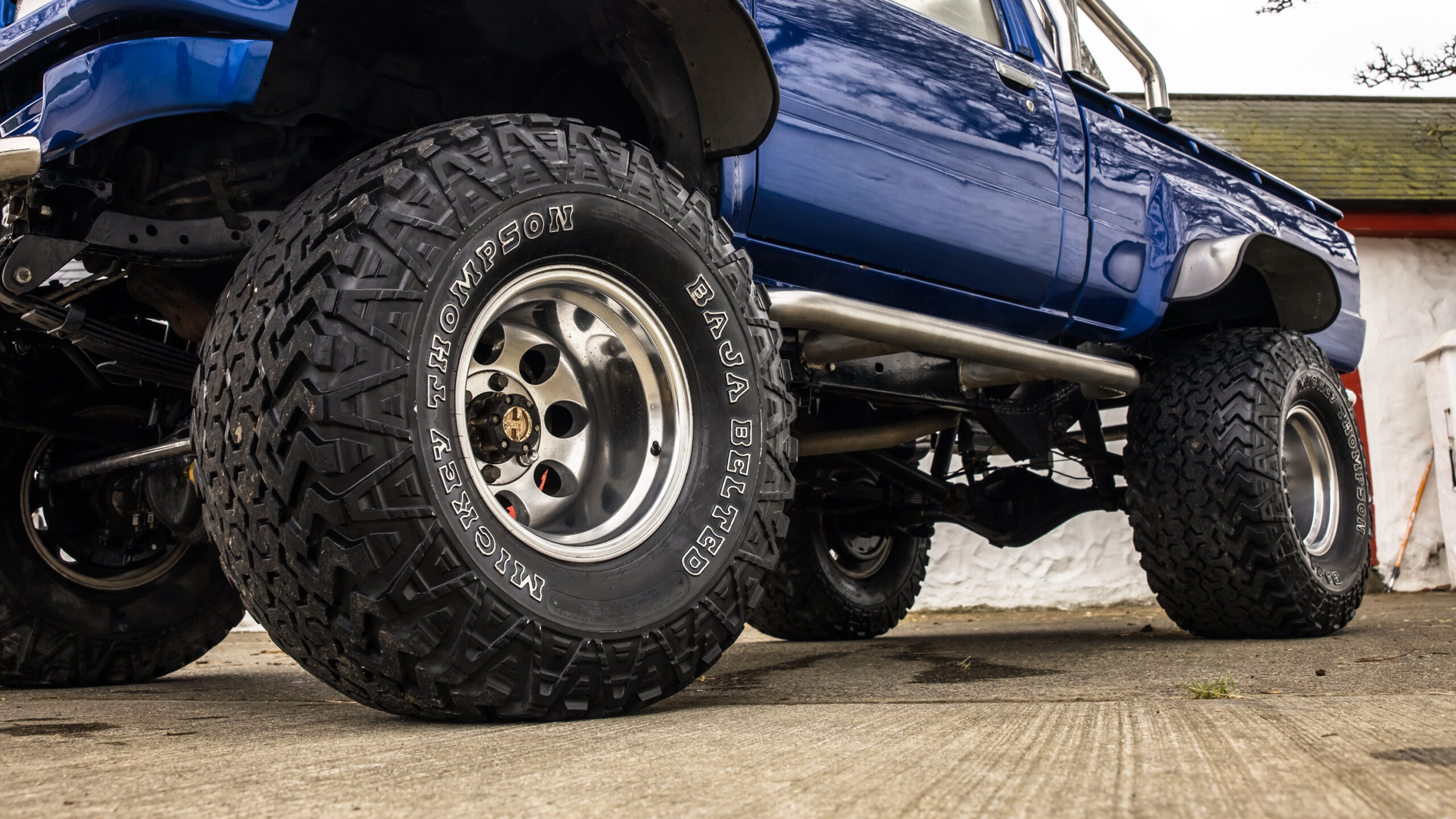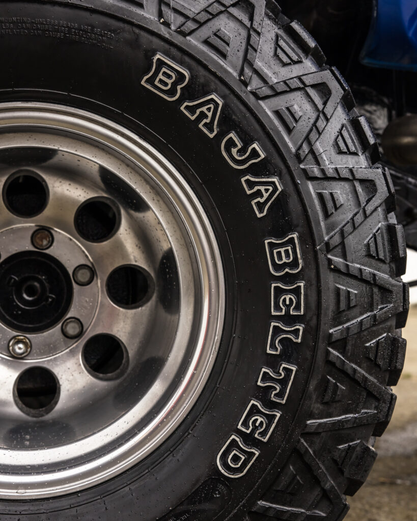 • Deep-dish polished alloy wheels with 35×17 Mickey Thompson Baja tyres.