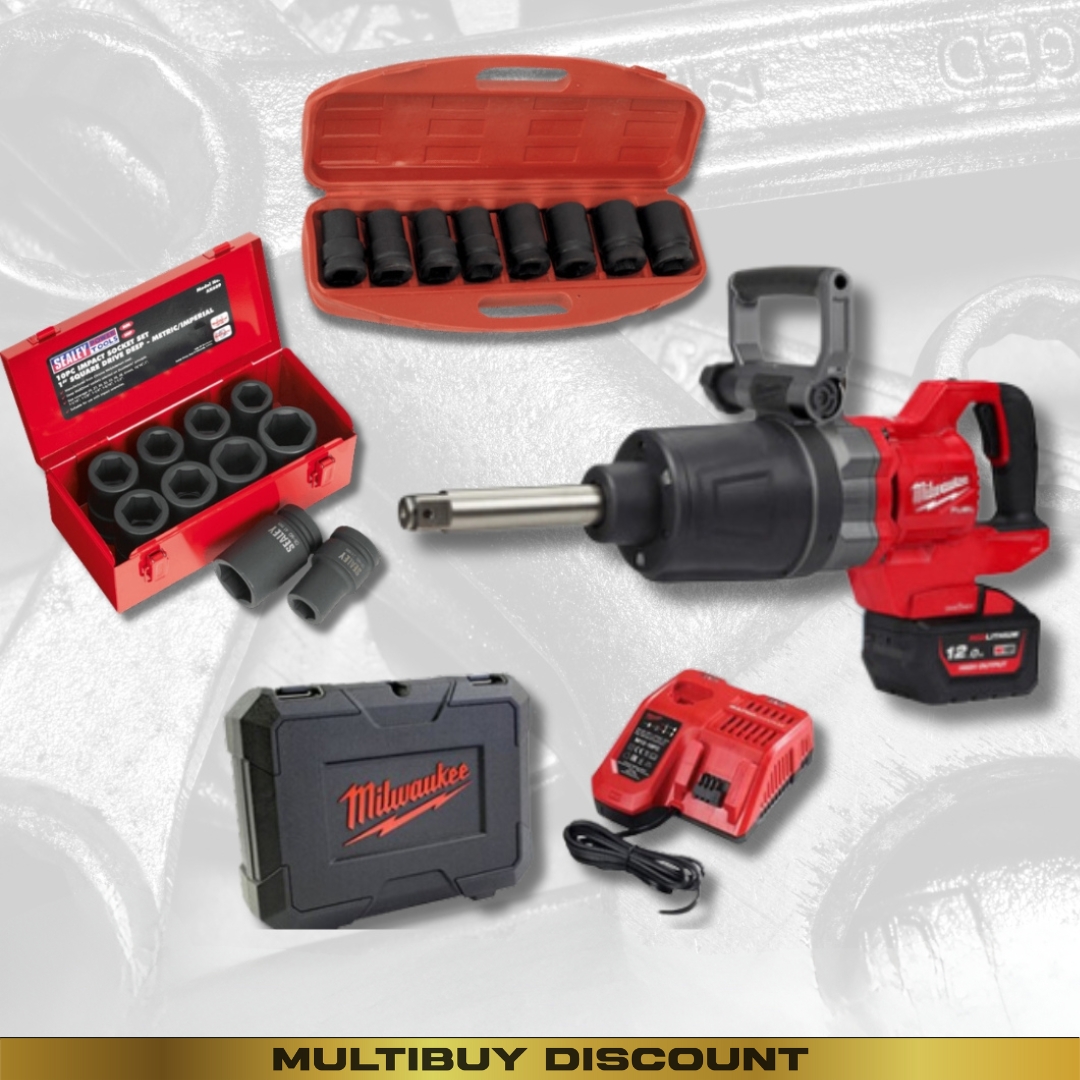 - Milwaukee M18 18V Fuel One-Key D-Handled 1″ Impact Wrench with 1x 12.0Ah Battery